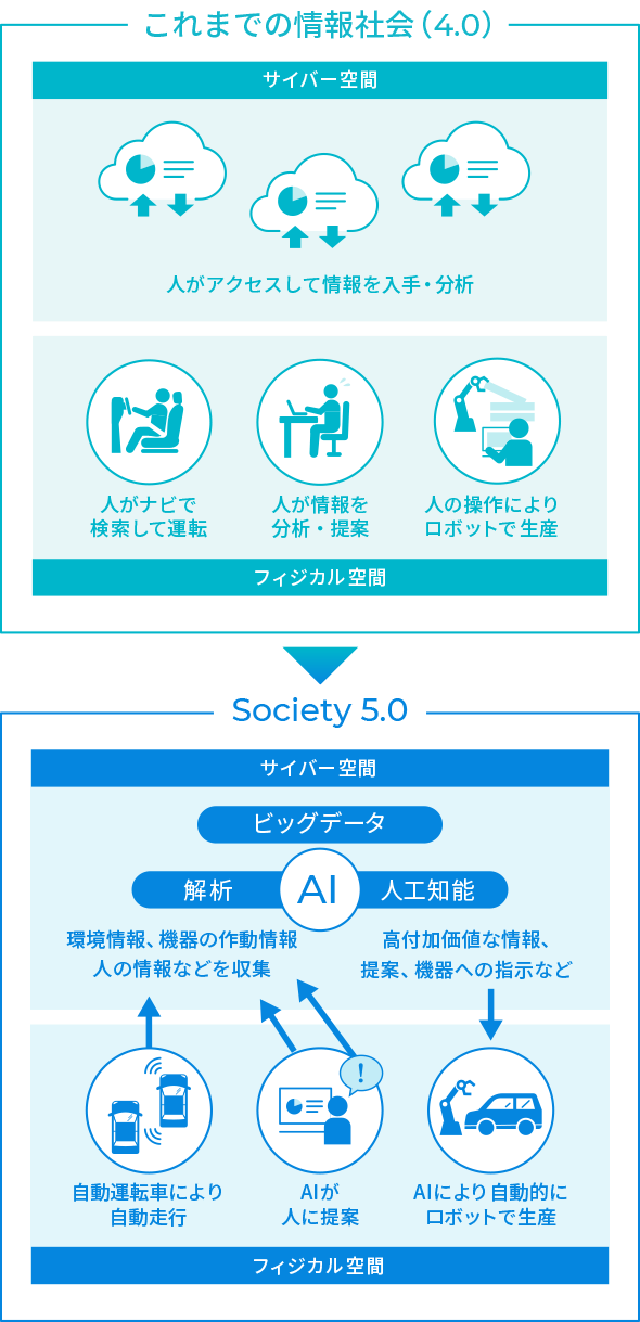 また、コミュニケーションの世界においてあらゆるもの同士がつながり、リアルな世界とサイバー空間が融合するSociety 5.0という考え方があります。これまでの社会は、インターネット空間にある情報やデータを人が入手し、人の手によってさまざまな処理が行われてきました。しかし、Society 5.0が実現すると、インターネット上にある膨大なデータをロボットやAIなどが自動的に処理を行い、人の手を必要とする作業が大幅に低減されることになります。