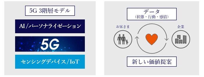 リカーリングモデルでは、IoTをはじめとしたセンサーを通じて集まったビッグデータが5G経由でAIによって分析されます。分析結果に基づいて設計された価値をお客さまに提案し、そのフィードバックをまたデータとして蓄積します。そのデータをさらに分析し、次なる価値提案へとつなげていきます。このようなデータと価値提案循環が新しい価値を創出していくことになります。そこで、KDDIでは「センシングデバイス/IoT」「5G」「AI/パーソナライゼーション」という独自の「5G 3階層モデル」によって、お客さまの状態・行動・感情をデータとして循環させ、エンゲージメントを深化させるビジネスモデルを構築していきます (図1) 。