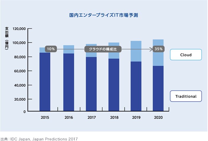 Amazonが提供しているAWSや、Microsoftの提供しているMicrosoft Azureといったクラウドサービスを企業システムに活用する動きというのは近年活発化しており、日本国内においても多くの企業にて採用されています。2020年までに、クラウドサービスへの投資額の支出構成比が10%(2015年)→35%(2020年)へと増えるという市場予測も出ており、このクラウド化は続くことが予想されています。