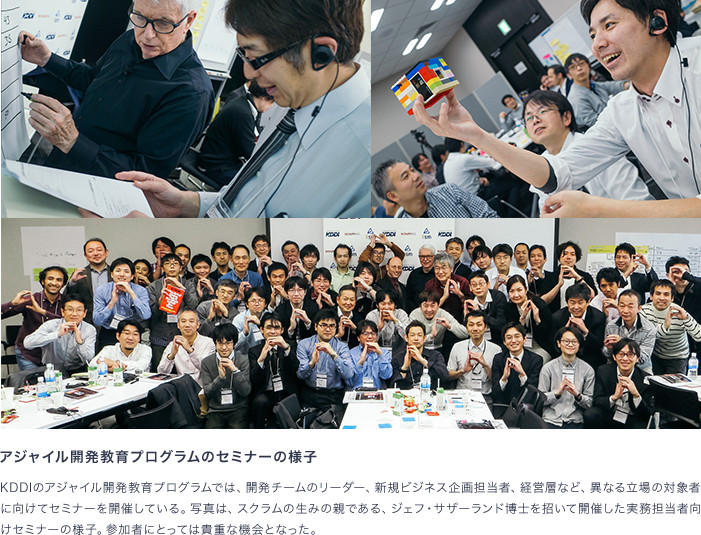 具体的に、KDDIは、開発にかかわる担当者だけでなく、経営層やマネジメント層も対象にしたセミナーを開催するなど、アジャイル開発に向けた組織変革の重要性に対する理解を促し、全社的な意思統一を支援(写真)。また、実際の開発現場には、コーチングスタッフが「スクラム」の実践に関する助言や指導を行い、継続的なサポートを実施する。