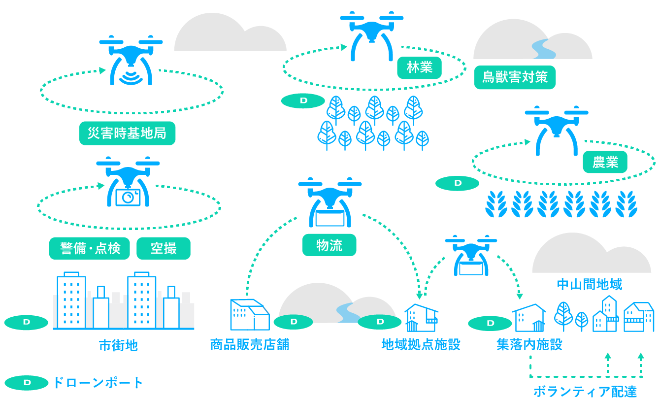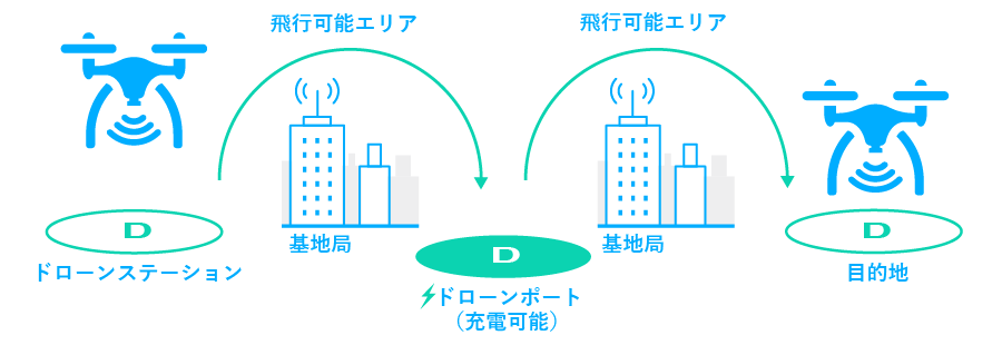 ちなみに、ドローンのもうひとつの問題点である連続稼働時間については、「ドローンポート」と呼ばれる充電基地のような設備を作ることで課題を解消します。