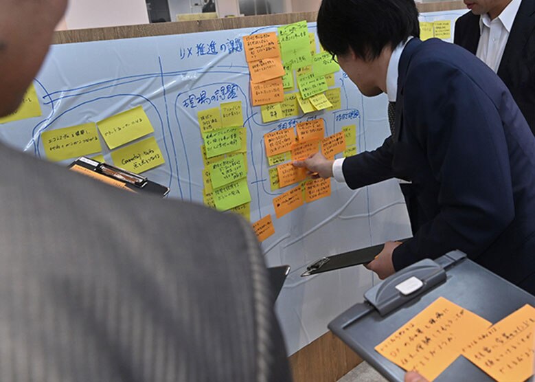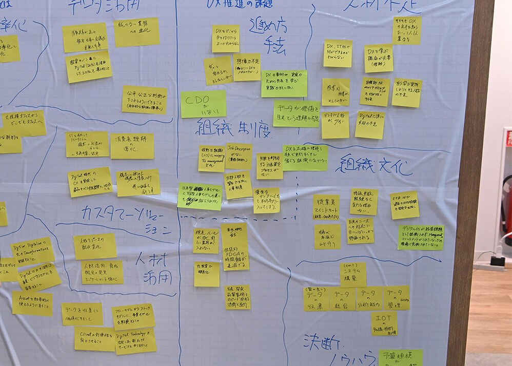 1つ目のフェーズで行われたのは「課題の共有」だ。ここでは「あなたにとってのDXとは?」という問いに対して、各自が付箋に意見を書き出し、共有していく。思考する時間と議論する時間を短時間で繰り返す中で、解決すべき課題への理解が深まる仕掛けだ。実際に出された意見には「顧客体験の刷新」や「バリューチェーンの可視化と継続改善」といったコメントが挙げられ、自社とは異なる視点から出された意見に驚きの表情を浮かべる参加者も見られた。