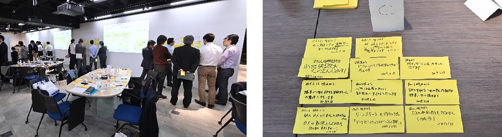 続いて行われたワークショップでは、3つのフェーズごとに「問い」が用意され、デザインシンキングの手法を用いた議論が行われた。序盤こそ硬さが見られた参加者だったが、ウォームアップの自己紹介などを通じて徐々にリラックスした雰囲気が広がり、議論が活発化していく様子が見て取れた。