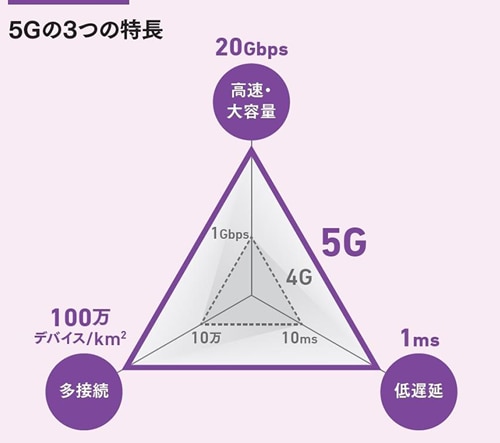 「高速・大容量」では、最大1Gbps程度だった4G ( LTE ) を大きく上回る、最大20Gbpsの通信速度が実現される予定だ。そのため、4Gで使われてきた3.6GHz以下の周波数帯に加え、新たに3.6〜6GHz帯や28GHz帯などを利用する。高い周波数帯は長距離通信が苦手なため、「ビームフォーミング」という技術を使い、電波を特定方向に向けることで遠くまで飛びやすくしたり、「ビームトラッキング」という技術によって、ユーザーを追いかけるように電波の方向を調整したりする技術開発が進められている。ちなみにKDDIは、自動車で移動する5Gユーザーにビームトラッキングで電波を向け続けながら、接続する基地局を切り替えるハンドオーバー試験に日本で初めて成功している。