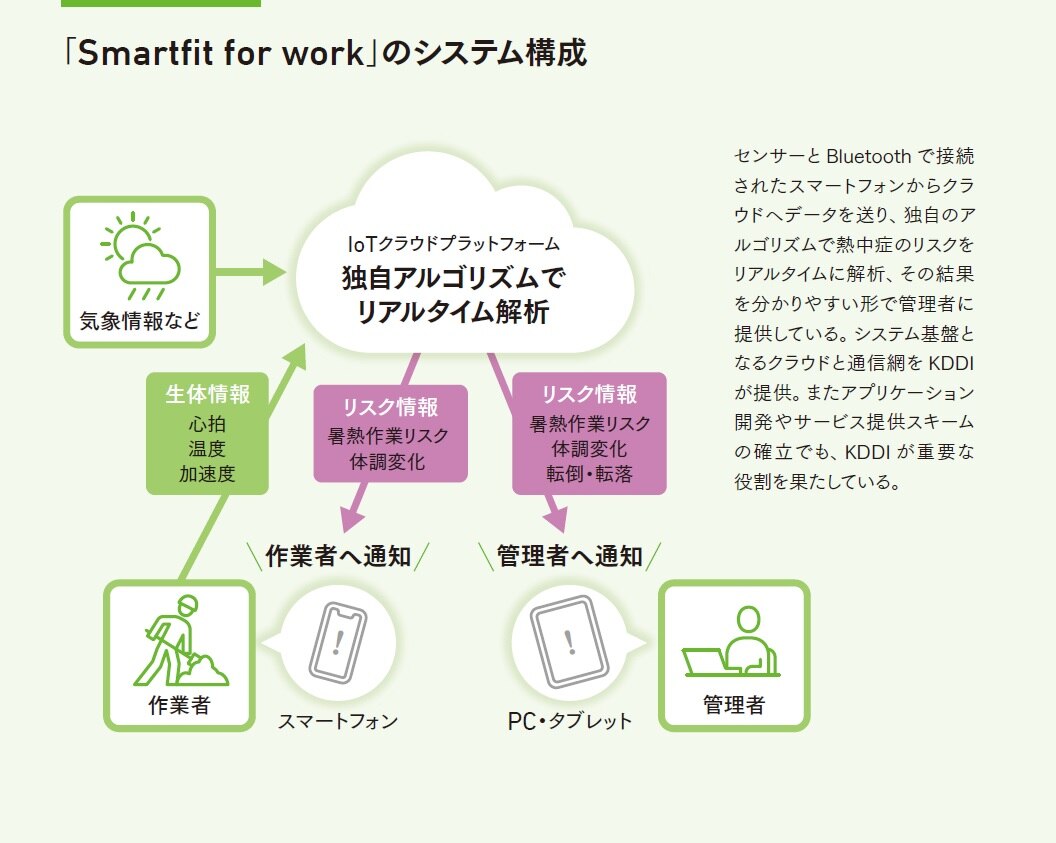 その代表例といえるのが「Smartfit for work」だ。これは、近年大きな社会問題となっている建設業などの作業現場での熱中症リスクを見える化して対策を促すサービスである。個人の当日の体調をAIとIoTで管理するウエアラブルシステムで、現場作業者のインナーウエアに組み込まれた生体センサーから、心拍や温度の生体情報や、加速度などを収集する。その情報と作業現場の気象情報を融合し、クラウド上の独自アルゴリズムで解析・評価を行い、その結果からリアルタイムでリスクを見える化する ( 図 ) 。