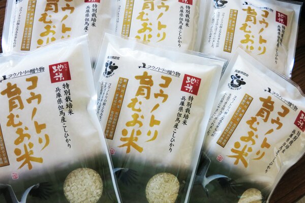 豊岡市の取り組みにより、今では豊岡市のコウノトリは179羽となり、コウノトリと共存する田んぼで育つ米を「コウノトリ育むお米」として販売。地域の特産品のブランディングにもつながった。