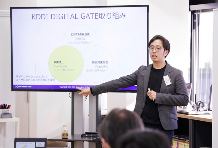 その後、同センターで蓄積したナレッジ・ノウハウを顧客企業にも提供し、顧客とともに新たなビジネス創出を行う場を開設しよう、という動きが生まれた。その施設こそが、2018年に東京・虎ノ門にオープンしたビジネス開発拠点「KDDI DIGITAL GATE(以下、DIGITAL GATE)」だ。DIGITAL GATEでは、デザインシンキングを体験できるワークショップ、PoC(実証実験)、実際のビジネスにつながるプロトタイプ開発を、アジャイル型企画開発手法を用いながら手掛けている。