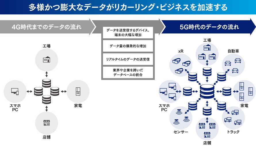 「高速・大容量」「高信頼・低遅延」「多接続」をコンセプトとする5Gによって、多くのデバイス・端末とリアルタイムに大量のデータのやり取りをできるようになれば、リカーリング・ビジネスは一気に加速していくでしょう。