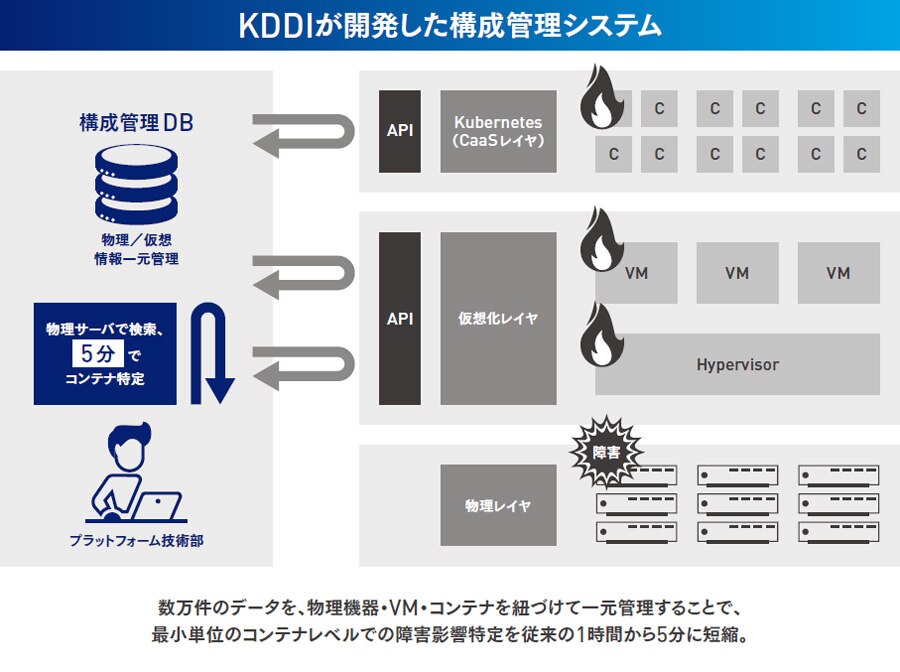 クラウドコンピューティングが台頭するトレンドを受け、KDDIでもクラウドシステムの開発に注力している。2012年には“KDDIクラウドプラットフォームサービス(KCPS)”、2018年には”KCPSベアメタルサーバー”の提供を開始。さらに同年、KCPSで培った構築ノウハウや運用知見を生かし、KDDI事業用のプライベートクラウド上でCaaS(Container as a Service)を利用可能とする“Gantry(ガントリー)”の開発に着手、2020年4月に運用を始めた。Gantryはアジャイル型企画開発で内製したシステムであり、2020年5月にはコンテナ情報の管理機能を加えた、他に類を見ない構成管理システムも実装した。KDDIのクラウドの強み、アジャイル×内製化がもたらすメリットなどを、開発に携わるメンバーに聞いた。