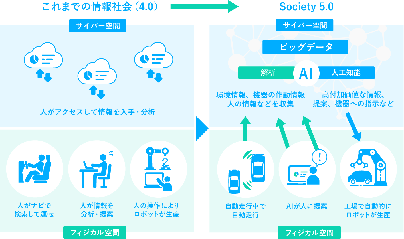 SDGsで掲げられた目標を達成するために、日本では「Society5.0」の実現が提唱されています。内閣府ではSociety5.0のことを「サイバー空間(仮想空間)とフィジカル空間(現実空間)を高度に融合させたシステムにより、経済発展と社会的課題の解決を両立する、人間中心の社会(Society)」と定義しており、情報社会(Society4.0)の次に到来する新たな社会と位置付けています。