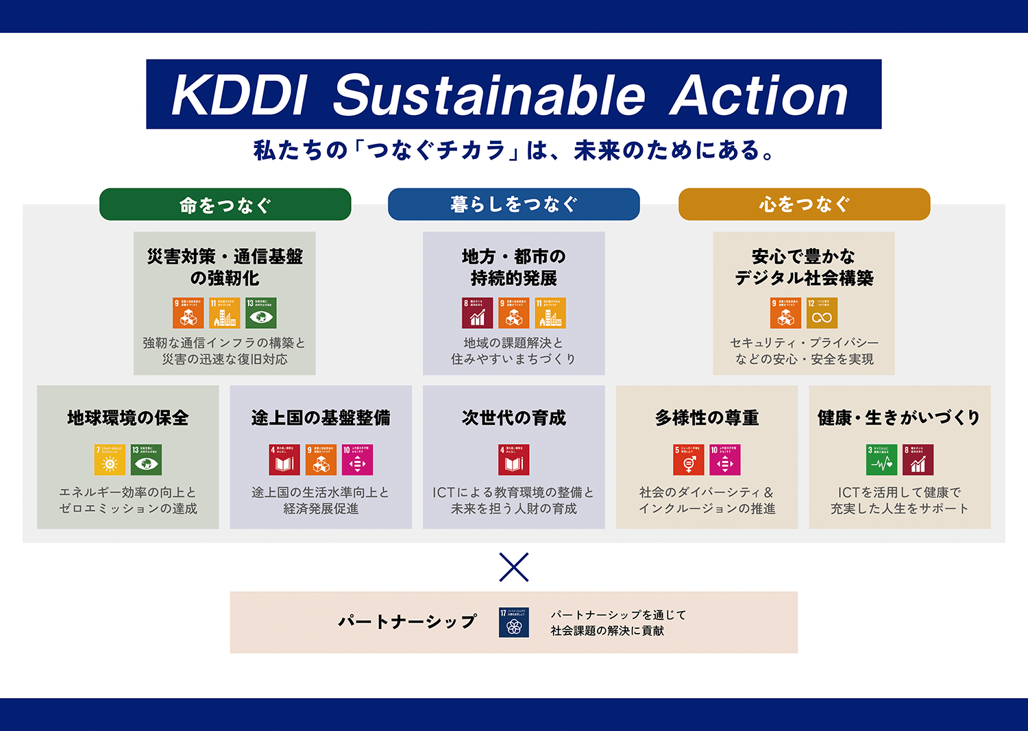 KDDIではSDGsへの取り組みとして、「命を、暮らしを、心をつなぐ」ことを大きな使命としています。
