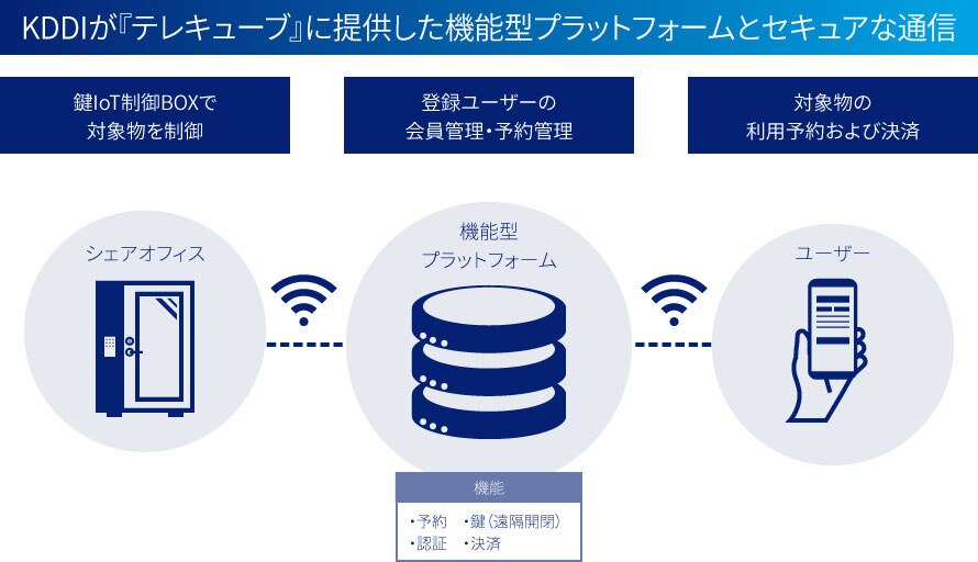 そこでKDDIが『テレキューブ』に提供したのが、予約やQR認証、スマートロックなどの機能型プラットフォームと、通信のサービスである。対象物と鍵IoT制御BOXを接続しクラウドと通信することで、対象物の会員に限定した、予約による制御を可能にし、決済機能も実現した。