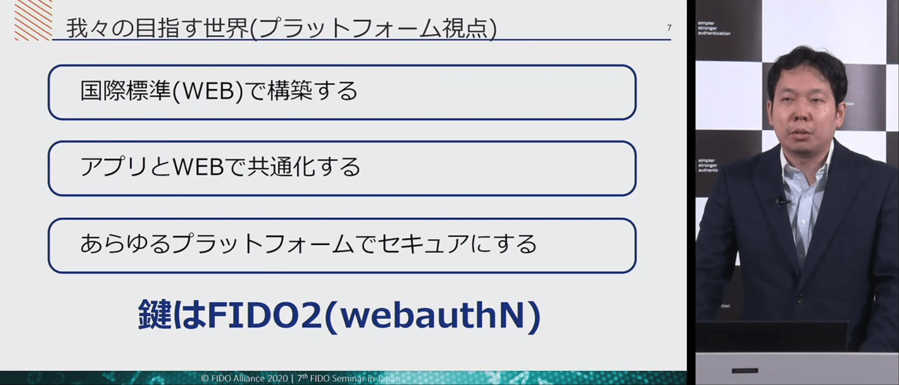 2020年12月1日(火) から4日(金) にかけて、FIDOアライアンスが主催する「FIDOセミナー in Japan -オンライン-」が開催されました。本セミナーは「パスワードのいらない世界へ、~主要プラットフォーマーによるFIDO対応、その展望と最新事例~」と題して行われ、日本国内においてFIDOを採用している多くのプラットフォーマーが自社の取り組み事例や導入事例などを紹介しました。