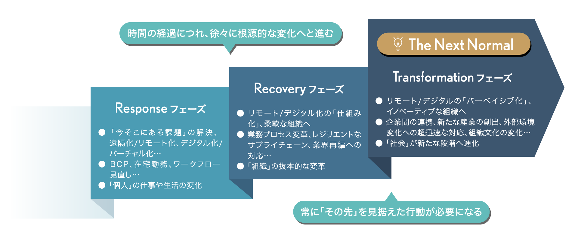 これは、新型コロナウイルスの感染拡大で一気に変化した環境にどう対処するかの時期を指す。在宅勤務への対応やBCPの見直し、業務フローの改善など、主に個々の従業員レベルでの対応が行われた。