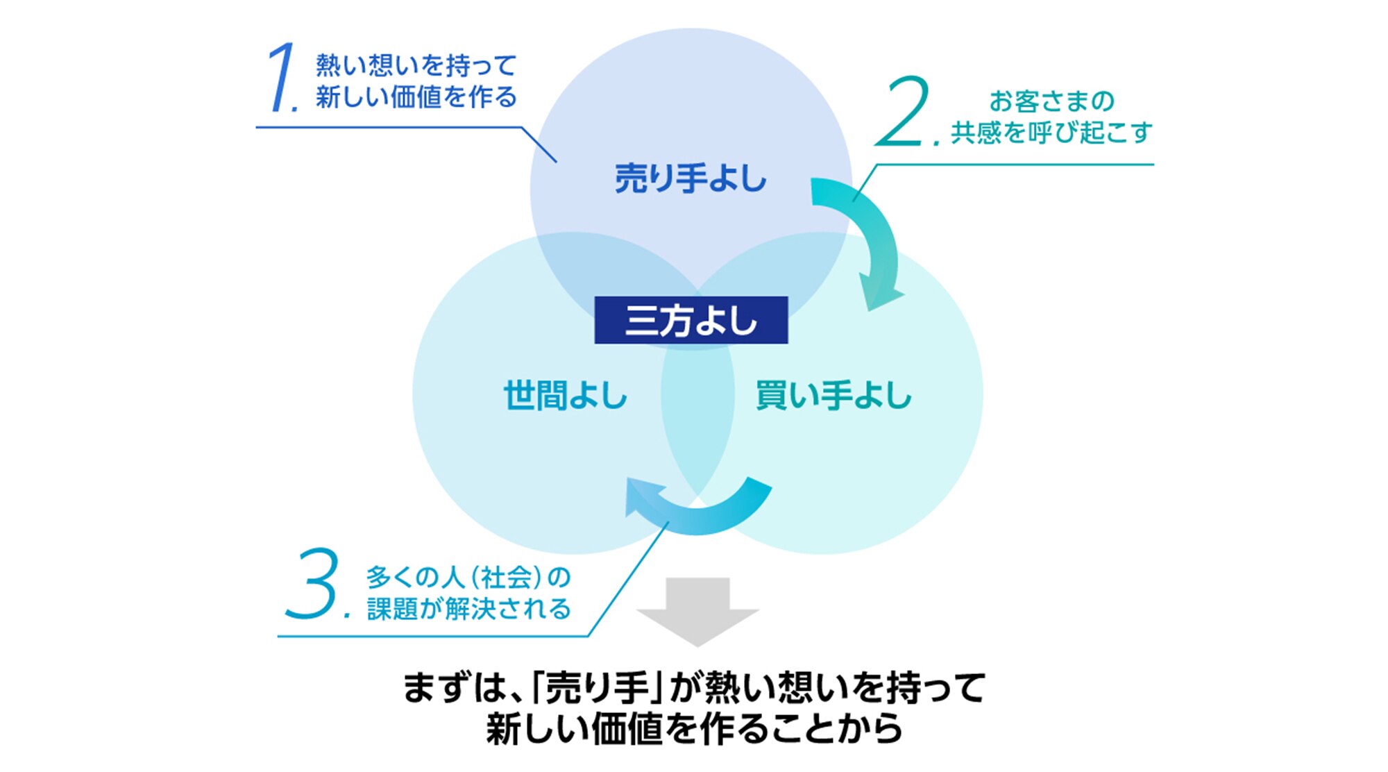 名和様 ぜひ意識したいのが「三方良し」の考え方です。「売り手良し、買い手良し、世間良し」という近江商人の心得ですね。実は、この順番が非常に重要なのです。まずは、社員やサプライヤーも含めた「売り手」が、熱い想いを持って新しい価値を
