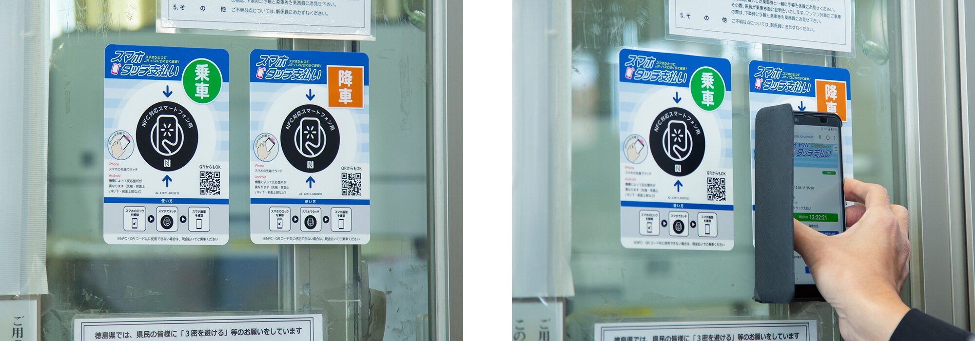 鉄道を利用する場合も、同様に駅の改札に設置された乗車用、降車用のそれぞれのNFCタグをスマホでタッチするか、QRコードを読み込む。