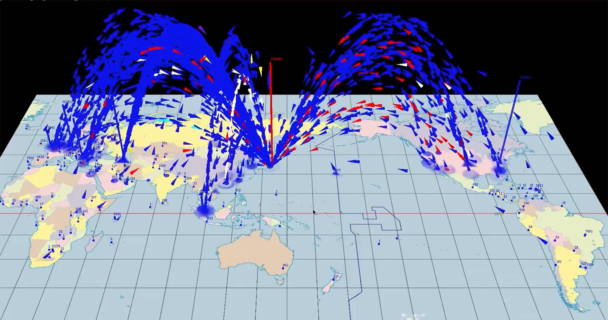 このようにダークネット観測は、ワーム感染拡大の初期兆候を捉える有力な手段です。実際、NICTが運用する観測網「NICTER」では、約30万個もの未使用IPアドレスを監視することで、インターネット上を飛び交うマルウェアのスキャン活動をリアルタイムに捕捉できています。観測画面上では、日本に向け世界各地から無数の「ロケット」(攻撃パケット) が飛来する様子が可視化されており、その高さで (例えば、低空ならポート番号22=SSH、高空ならポート番号80=Webなど) 狙う機器やサービスが一目で把握できます。また、マルウェアに感染してしまった機器がどの国にどの程度あるのか、日本へはどの国からどのくらい攻撃があるのかというワーム型のマルウェアの活動もリアルタイムで捉えています。