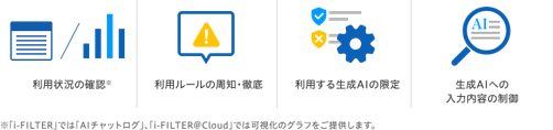 生成AIはデータをもとに新しい情報やコンテンツを自動生成する技術であり、昨今その業務活用が期待されています。「AIチャットフィルター」では利用する生成AIの限定や入力内容を制御することで、安全な利用環境を実現します。