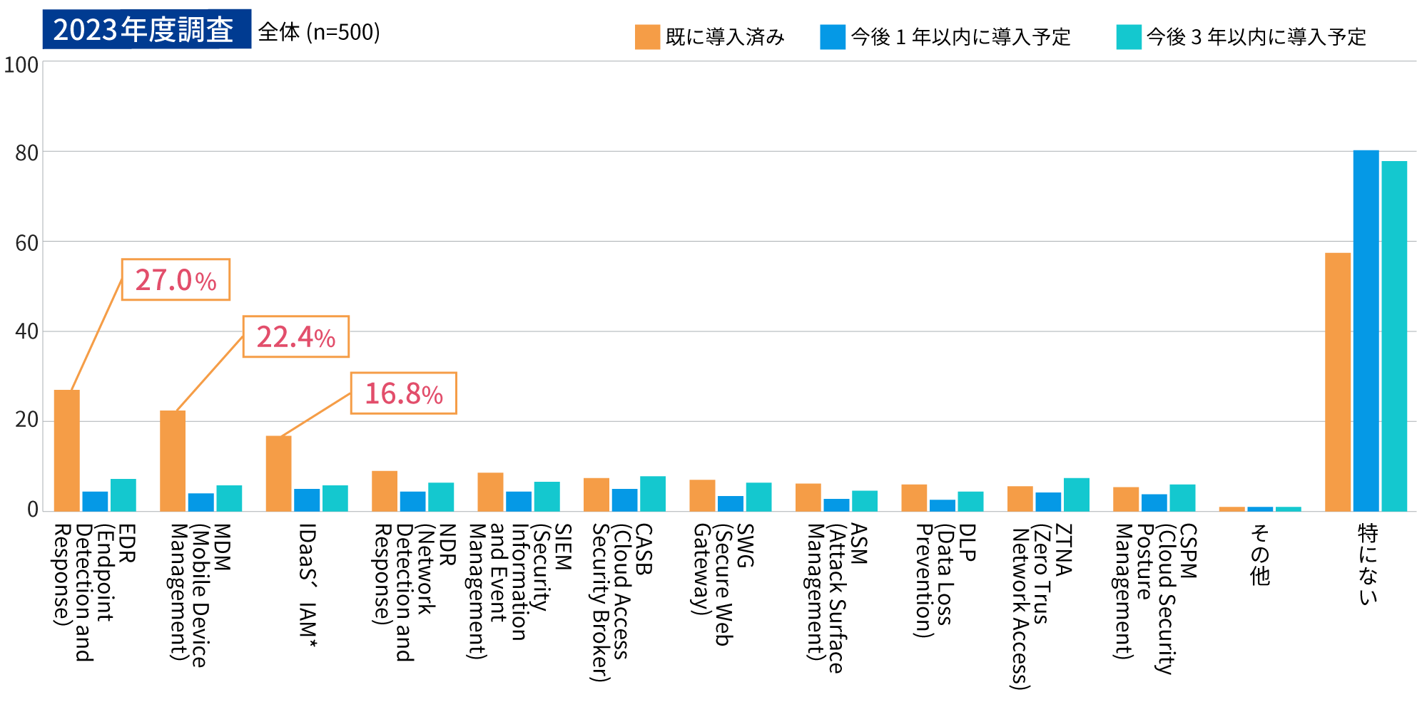 2023年度にKDDIが実施した企業500社を対象としたアンケートでは、ゼロトラスト関連ツールの導入状況と今後の導入予定について調査しました。「既に導入済み」の回答で最も割合が高かった項目は「EDR」で27.0%、次いで「MDM」(22.4%)、「IDaaS、IAM」(16.8%)という結果になりました。