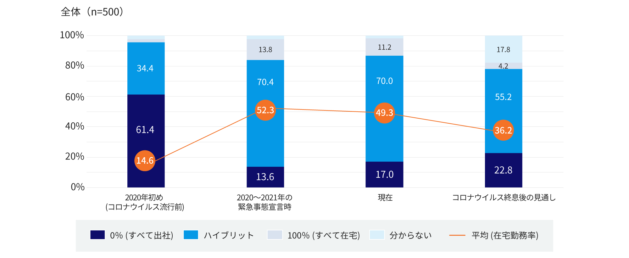 まずは働き方の実態から見てみましょう。新型コロナウイルス感染症流行前の「2020年初め」と「2020年〜2021年の緊急事態宣言時」「現在」、そして「コロナウイルス終息後(の見通し)」の四つの時期に分けてテレワーク(在宅勤務)率を調査しました。今さら改めて指摘するまでもないことですが、2020年〜2021年の緊急事態宣言時を境にテレワークは一気に「当たり前」の選択肢として浸透したことが改めて鮮明になっています。