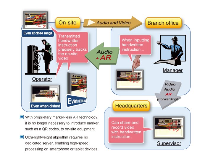 Remote work support system that can easily, safely, and quality relay video taken from far away work sites to Smartphones and Tablets or mobile computers. By using AR technology and displaying handwritten instructions written on the work instructor’s terminal on the work site’s screen in real time, intuitive instructions can be provided, and work efficiency and mistakes can be reduced.