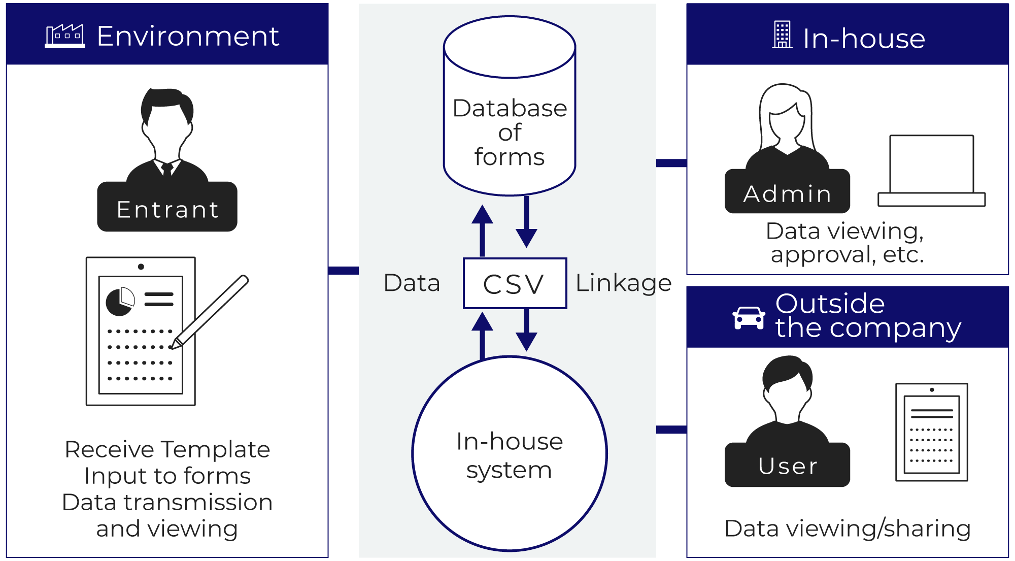 Centralized data management enables quick information sharing and reduces the risk of information loss and information leakage. In addition, the collected data is automatically converted to materials or documents, etc. through coordination with the internal system. This not only makes paperwork more efficient, but also enables a wide range of IT solutions that solve the problems faced by each company.
