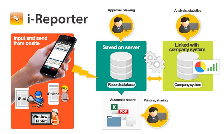 With the ConMas i-Reporter, there is no need to return to the company, re-enter information on a computer, or perform post-processing tasks such as creating separate report documents. Reporting and recording work is completed at the workplace where the employee is outside the office, and information can be shared, approved, and used immediately. Data is centrally managed, and security is secured by setting access rights.