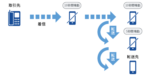 一定時間 (任意設定可能) 応答がない場合に、あらかじめご指定いただいた5つまでの転送先に順次転送することが可能となります。