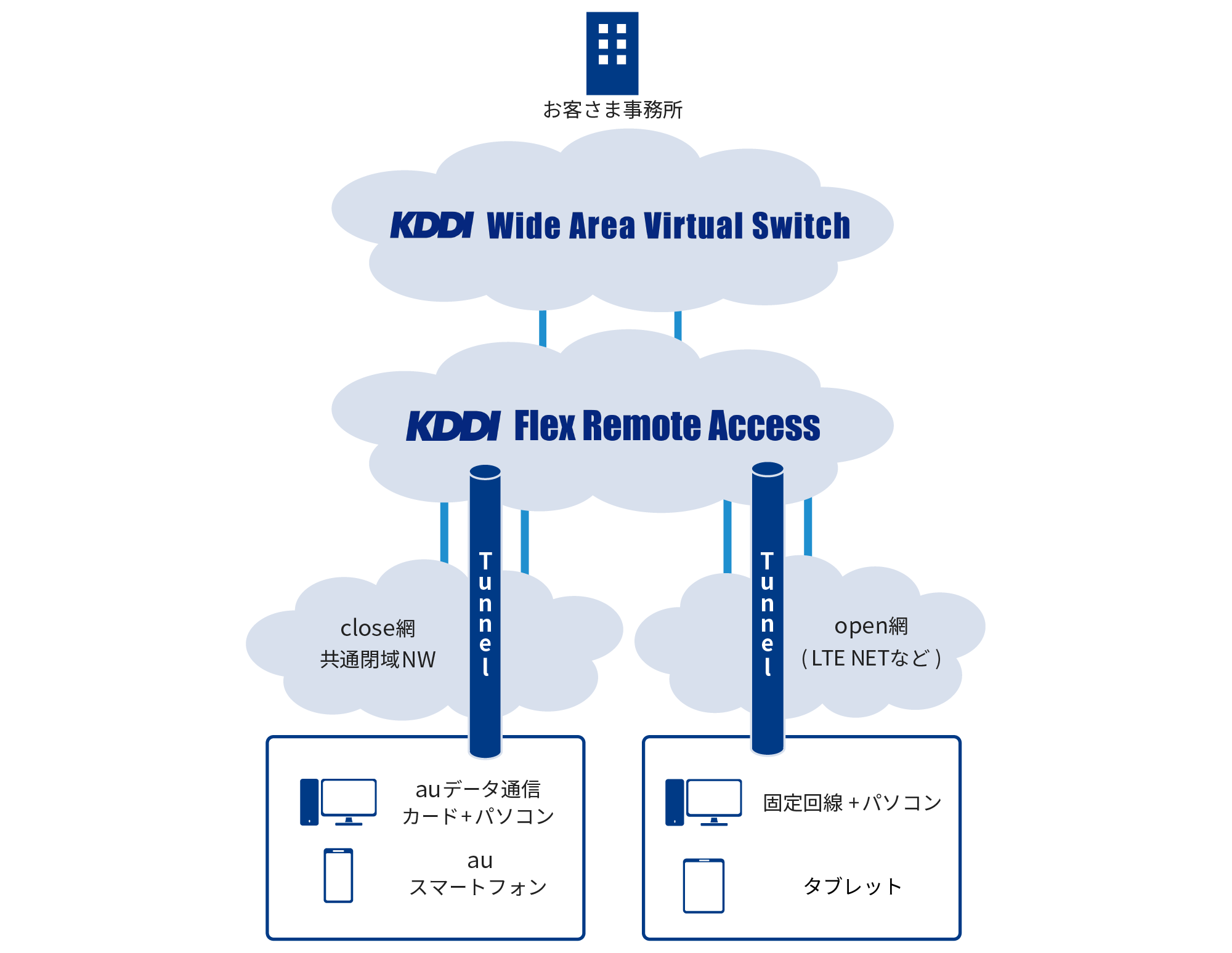 さまざまな通信デバイス・通信環境からお客さまの社内ネットワークへリモートアクセスを行えます。お客さまは場所を問わず、スマートフォン・タブレット・パソコンから、tunneling技術 (注) を利用して安全に社内システムへ接続いただけます。
