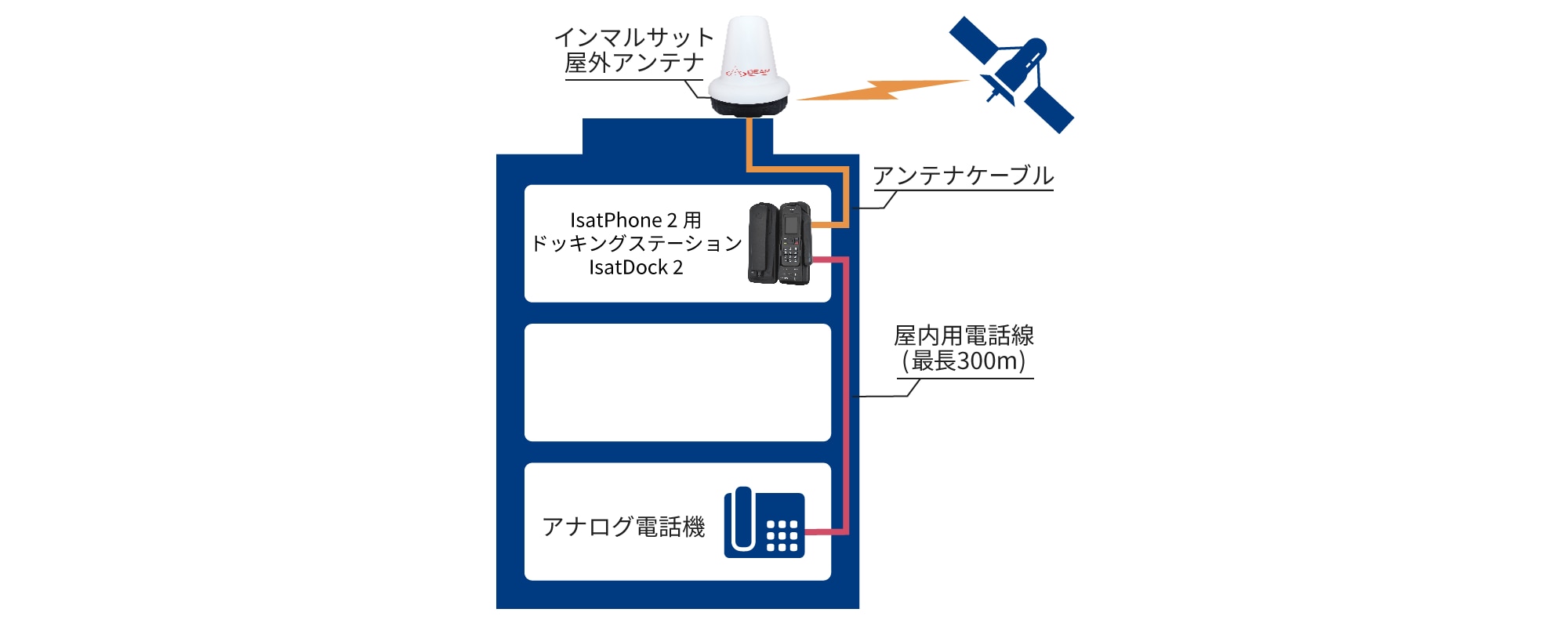 屋内の所定場所にIsatPhone 2の専用ドッキングステーション『IsatDock 2』※ を設置し、屋外アンテナとケーブルで接続します。IsatDock 2に屋内用電話線を接続して外付けのアナログ電話機を1回線 (注1) ご利用可能となります。