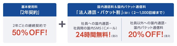 2年間の継続利用を条件に「2年契約」または「2年契約 (自動更新なし)」と「法人通話・パケット割 (注1)」にご加入いただくことで、基本使用料も通話料もおトク!