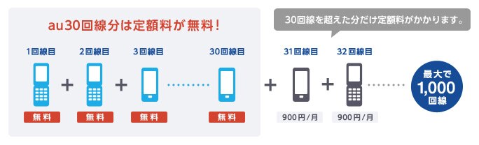 月額定額料 (税込) | au携帯30回線まで無料 30回線を超える部分: 990円/回線・月 |