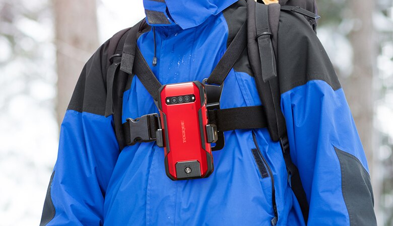同梱されているアタッチメントや落下防止コードを用いて、自撮り棒/三脚/バイクマウントなどに取り付け可能です。前機種「TORQUE 5G」が1部品構成だったのに対し、「TORQUE G06」は5部品構成となり、取り付け対象へのアレンジがしやすくなりました。