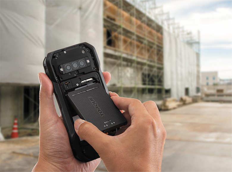 取りはずし可能な4,270mAhの大容量電池パックを搭載しています。本体の小型化、軽量化を実現しつつ、電池容量は、前機種「TORQUE 5G」比較で約7%アップしました。本体に電池パックが装着されている状態では、ワイヤレス充電、USB Type-C接続充電が可能です。
