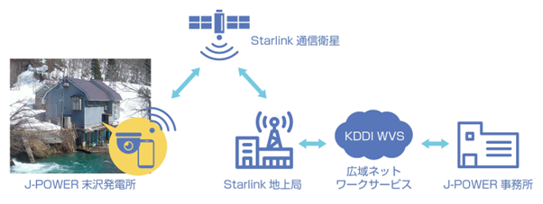 電源開発株式会社 (以下「Jパワー」、本社: 東京都中央区、代表取締役社長 社長執行役員: 菅野 等) とKDDI株式会社 (以下「KDDI」、本社: 東京都千代田区、代表取締役社長 CEO: 髙橋 誠) は、J-POWERテレコミュニケーションサービス株式会社と合同で、10月3日よりKDDIが法人・自治体向けに提供する衛星ブロードバンド「Starlink Business」(以下「Starlink」) (注1) と広域ネットワークサービス「KDDI Wide Area Virtual Switch 」(以下「KDDI WVS」) を導入し、保守高度化による電力の安定供給に向け、山間部での高速・大容量のネットワーク通信の実証試験を末沢発電所 (新潟県魚沼市) のリパワリング工事 (注2) にて開始しました。