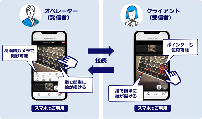コールセンターやカスタマーサポート業務などでは、電話での音声通話によるお客さまへの問い合わせ対応業務 (故障・修理や現況確認など) が主流でしたが、音声通話のみではお客さま状況の確認が難しいことが課題でした。ビデオ通話の活用が期待されていましたが、ビデオ通話アプリを企業側・お客さま側ともにインストールし、アカウントを交換する必要がありました。