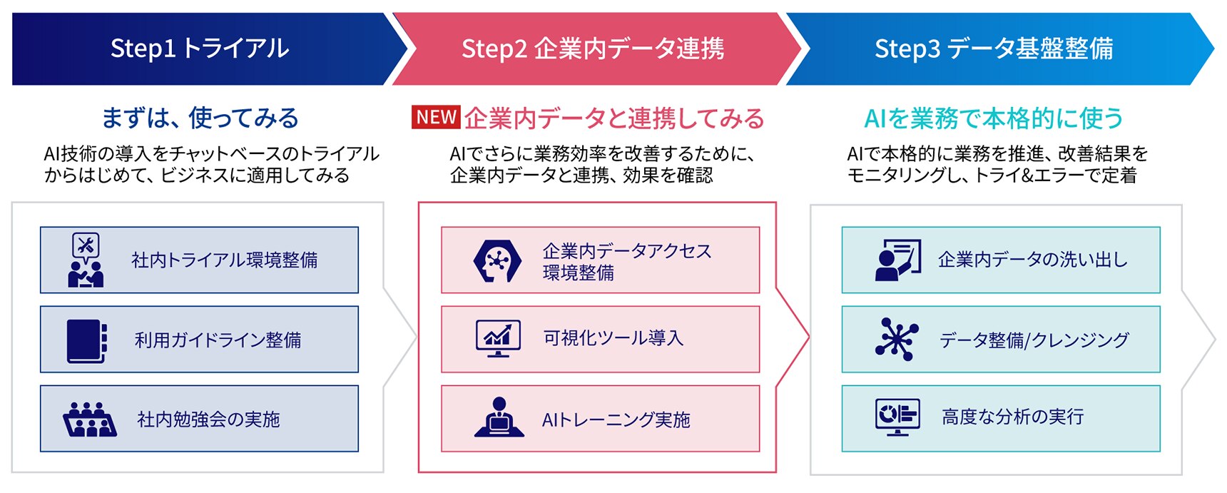 お客さまの企業内にある企業内データを取り込み、生成AIと連携することで、売上実績データや業務マニュアルに基づいた回答や要約などが可能になり、お客さまのさらなる業務効率化や生産性向上に貢献します。