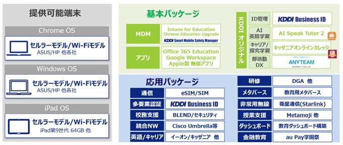KDDIは2024年4月23日、学校現場における児童生徒の1人1台端末の整備・更新に向けた「GIGAスクール構想 第2期 (注1)」の実現を支援する「KDDI GIGA基本・応用パッケージ (以下 本パッケージ)」の申し込み受け付けを開始します。本パッケージは、3つのOS (注2) と各種メーカーの端末 (パソコンやタブレットなど) に対応し、自治体や学校の要望に応じた利用者のID管理から英語・キャリア学習まで幅広いサービスを一気通貫で提供し、教育DXを支援するサービスです。