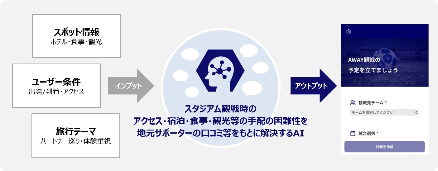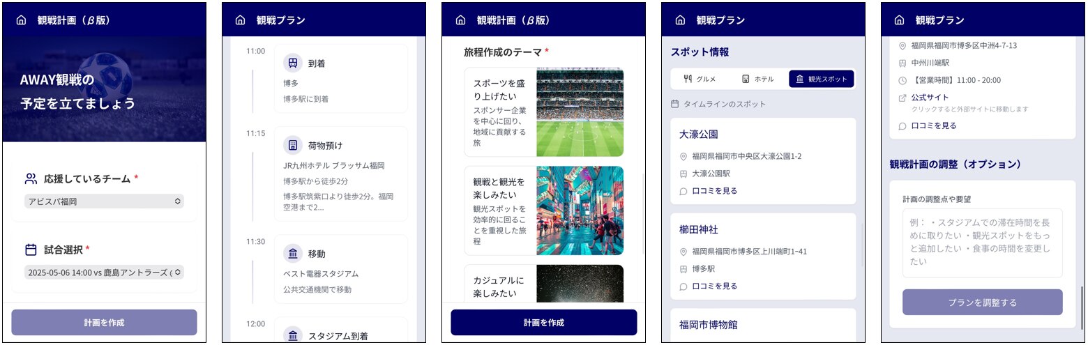 試合日程、スタジアムの最寄り駅到着時刻と出発時刻、観光スタイルを選択すると、選択した情報に合わせて最適な観光プランをAIが生成します。また、生成された観光プランに対する要望を自然言語で入力すると、入力内容に応じて観光プランを修正します。なお、アビスパ福岡の公式コミュニティ「アビスパDAO」でサポーターから寄せられた、飲食店や観光地の情報・口コミから、観光プランの作成に必要なデータを抽出・集約します。