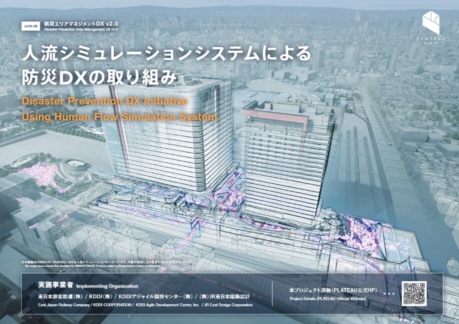 KDDIは2022年および2024年の国土交通省PLATEAUプロジェクトにおいて、本システムを開発しました。本システムは2025年3月に提供開始したWAKONX SmartCityソリューションとして、KDDIの新本社が所在するTAKANAWA GATEWAY CITYで実装されています。災害時だけでなく、平常時のイベントの混雑予測や人流滞留の防止策策定にも活用されています。