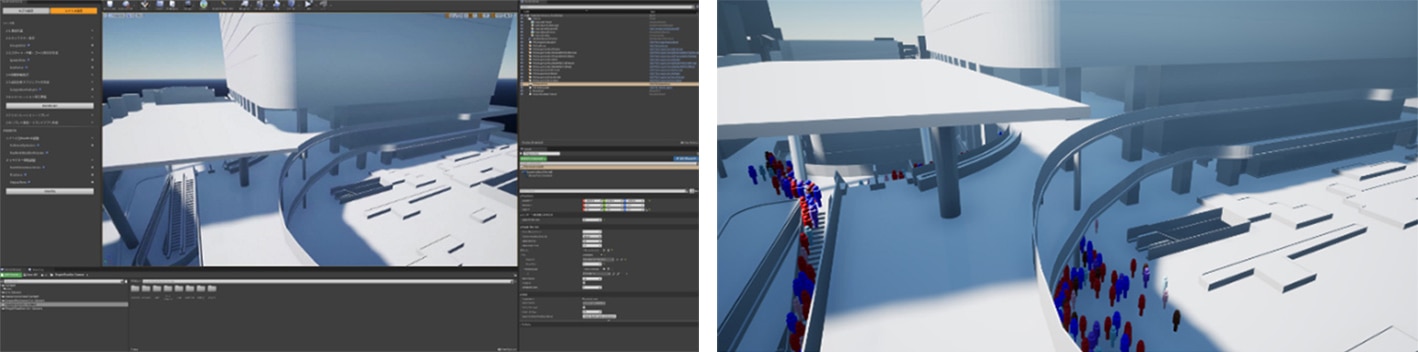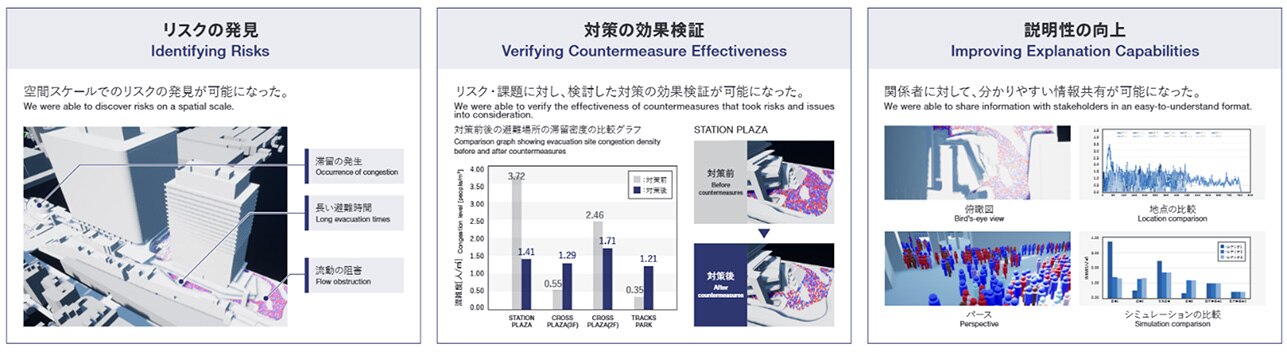 開業前の街においてもシミュレーションが可能であるため、避難にかかる所要時間や混雑リスクの高い地点を事前に発見でき、対応策を迅速かつ正確に検討することに貢献しました。