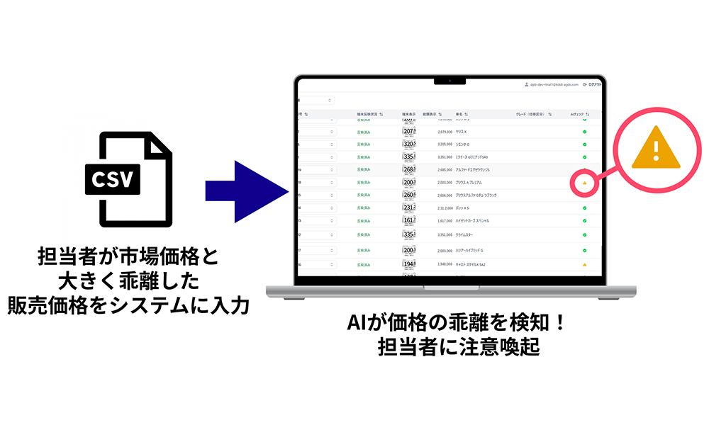 AIが車両情報に基づき最新の市場価格を数分で算出します。店舗担当者が設定した販売価格と市場価格に大きな乖離が見られる場合に、システム画面に「!」マークで警告し、販売価格の見直しを提案します。これにより、店舗において適正な価格での販売や売れ残り削減に貢献します。